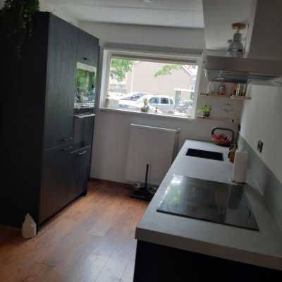 Een plaatje, deze strakke zachtgrijze moderne keuken met deels ingebouwde kastenwand. Door...
