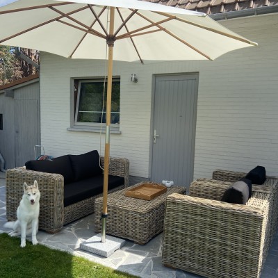 Zelfs onze hond Kyra geniet van het mooie tuinset.